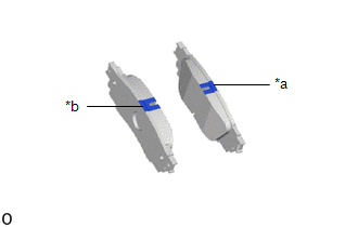 (b) Instale 2 nuevas placas indicadoras de desgaste de la pastilla del freno de disco trasero en cada pastilla del freno de disco trasero. AVISO: Instale la placa indicadora de desgaste de las pastillas del freno de disco trasero en las posiciones y el sentido correctos. |
