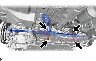 (c) Extraiga los 2 pernos, las 2 tuercas y el conjunto de la articulación de la servodirección del subconjunto del travesaño de la suspensión delantera. AVISO: No gire la tuerca, ya que tiene un tope propio. Afloje el perno con la tuerca fijada. |