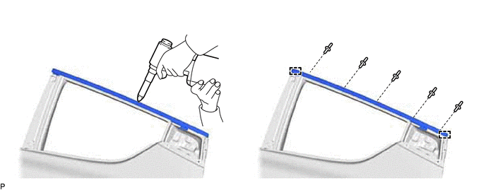 (b) Con la ayuda de una remachadora neumática o una remachadora manual con una pieza de extremidad, instale la moldura superior del marco de las ventanillas traseras con 5 remaches nuevos.